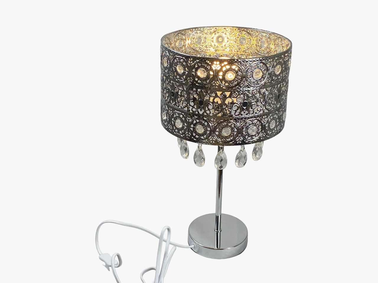 Crystal Shade Table Lamp Elegant moda style light shade with metal fixture from clear pendants for a dazzling glow when lit up in bedrooms, living room.